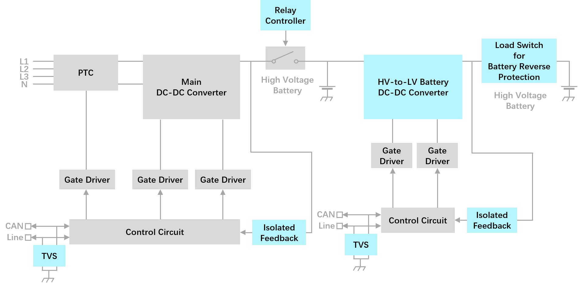 电网中的交流电通过交流充电桩直接给车载充电器 (OBC) 供电,OBC 把 AC 转换成 DC,然后通过配电箱为车内的动力电池充电。直流充电桩则包含许多 AC-DC 电源模块。从目前充电桩市场的状况来看,有 3 大趋势:宽范围的恒定功率、宽范围的输出电压、更高功率的模块。 两个主要功率级。首先,功率因素校正 (PFC) 级,保持输入电流和电压之间的相位关系,最大限度地减少线路/电网电流的总谐波失真 (THD) 。这有助于减少任何浪费的无功功率,提高整体能效。 第二功率级是 DC-DC 转换器,它从 PFC 级获得 DC 输出,并将其转换为电池充电所需的电平。转换器的输出电压和电流基于电池的整体健康状态和充电状态随时间变化。 不论是功率因数校正(PFC)、原边侧 DC-DC、或二次整流,Vsport微电都具有相应的解决方案,汽车系列产品涵盖二极管、MOSFET、TVS 等各类产品。比如:整流+LLC 构成了充电桩的基本电路,可采用 FRED(快恢复二极管)方案;CAN 通讯口的 ESD 保护。