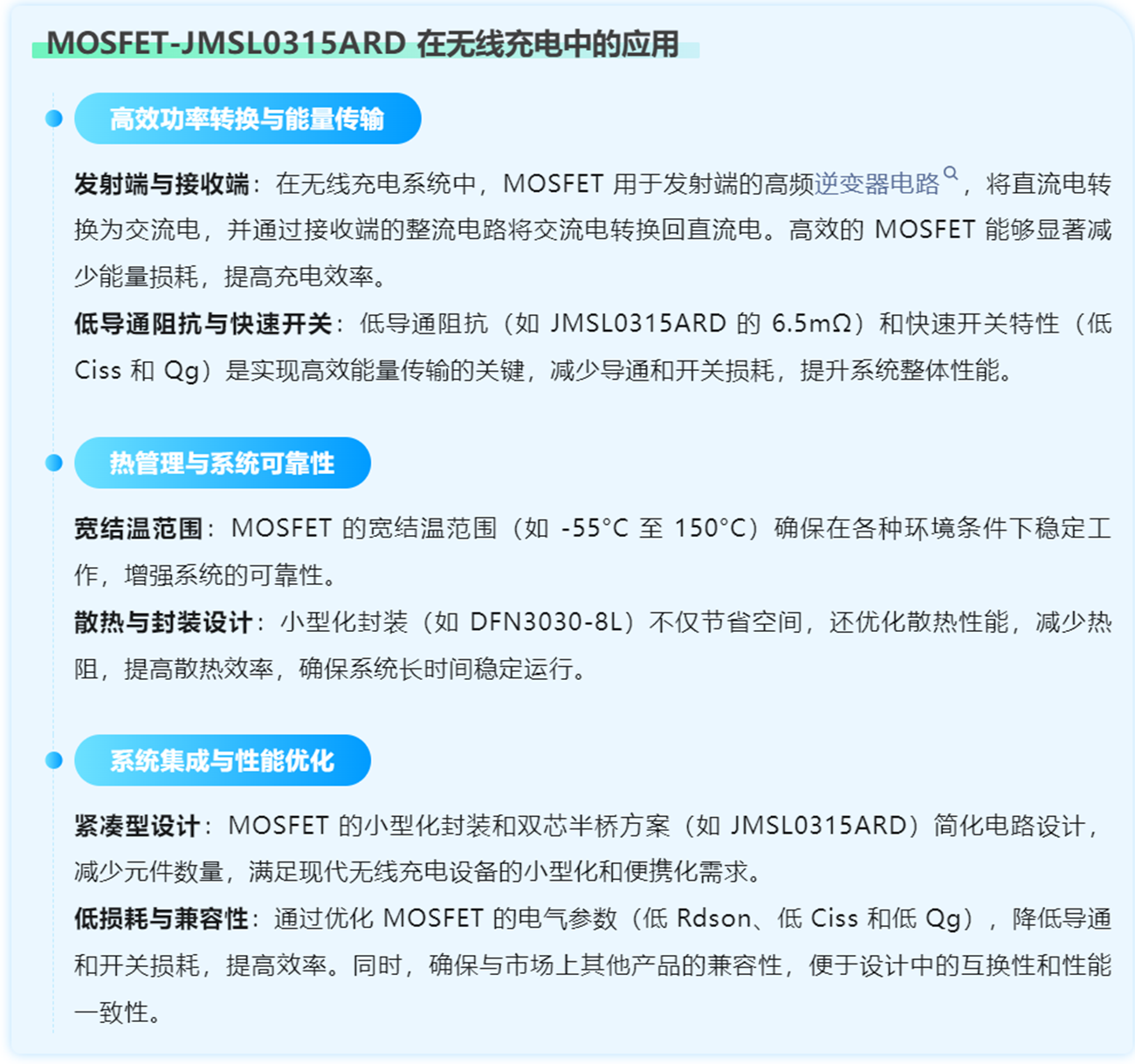 JMSL0315ARD 凭借其紧凑型设计、优异的电气性能和可控的封装技术,成为无线充电应用中高性能 MOSFET 的理想选择。