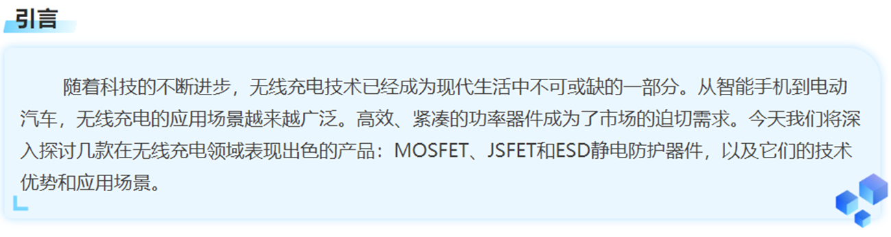 ESD防护器件、JSFET和MOSFET在无线充电器中的应用,不仅显著提升了充电效率,还大幅增强了设备的可靠性和耐用性。ESD防护器件有效防止静电放电对敏感电路的损害,确保设备在频繁插拔和复杂环境下的稳定运行。JSFET和MOSFET则通过其低导通阻抗和快速开关特性,优化了功率转换效率,减少了能量损耗,从而提高了无线充电的整体性能。